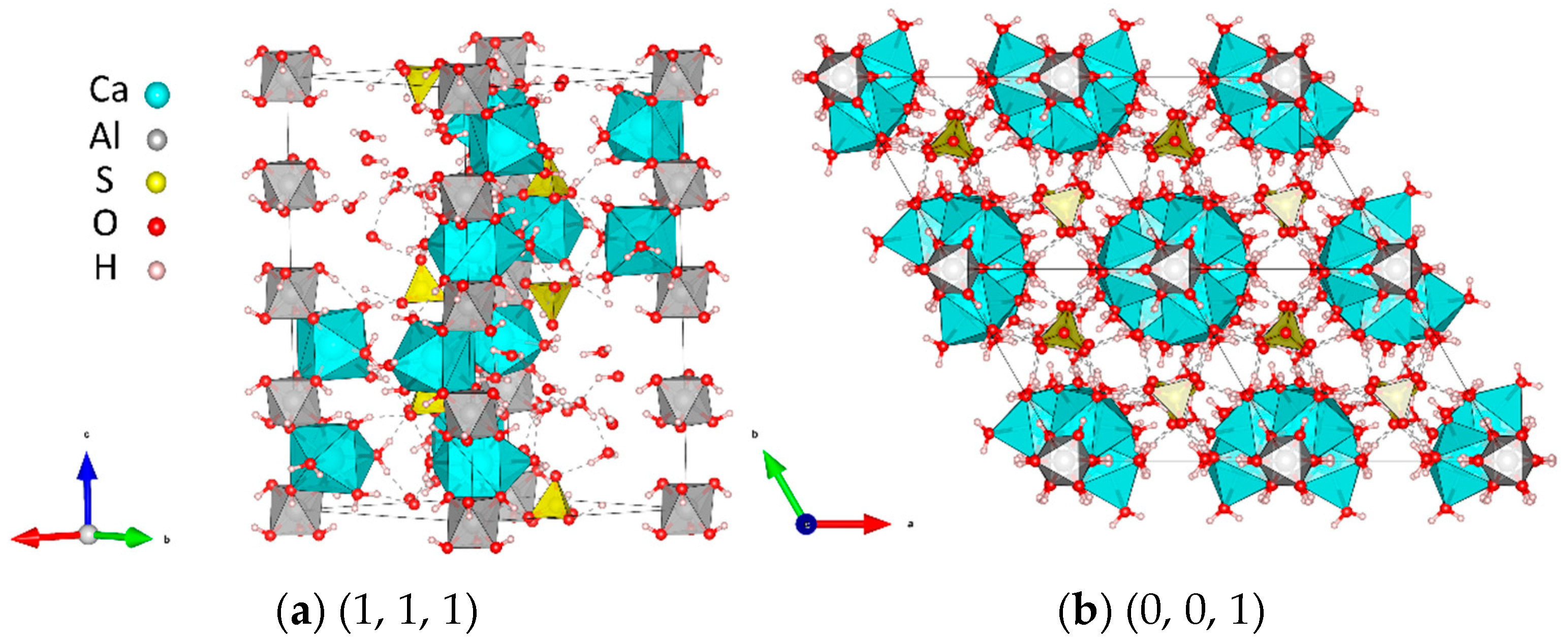 Figure 9. Ettringite is characterized by low solubility and high strength. It combines a large amount of crystal water in its chemical structure. Its volume is about 2.5 times that of hydrated calcium aluminate, which leads the solid-phase volume to increase significantly, as shown in Equations (2)–(5).