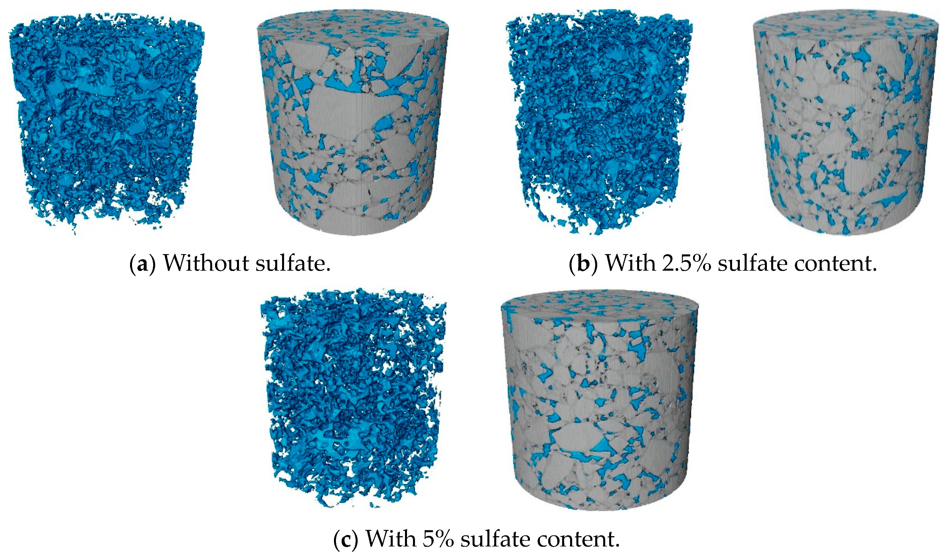 According to the results of CT scanning, the three-dimensional morphology of cement-stabilized macadam specimens was reconstructed in Avizo image processing software. The image contrast was set to 0–200, and the pore domain value was set to 1–70. The pore distribution and three-dimensional morphology of the specimens under different sulfate contents after treatment are shown in
