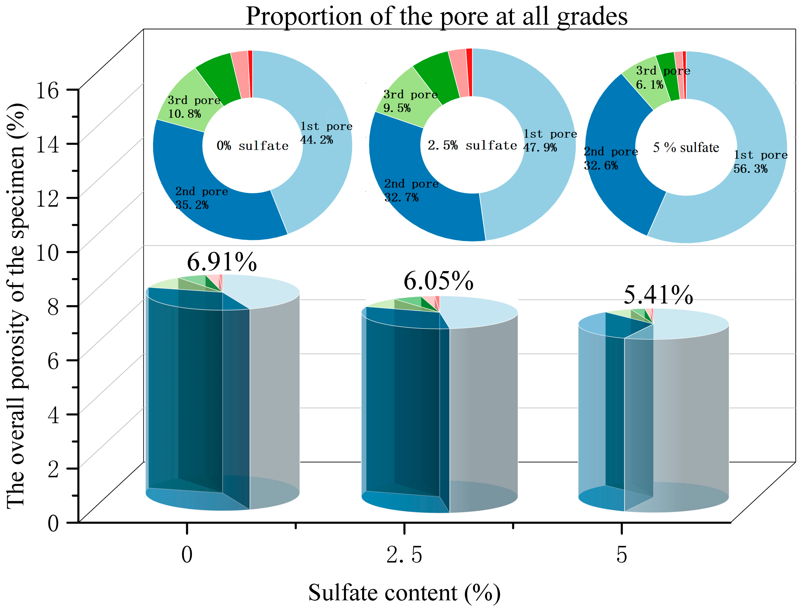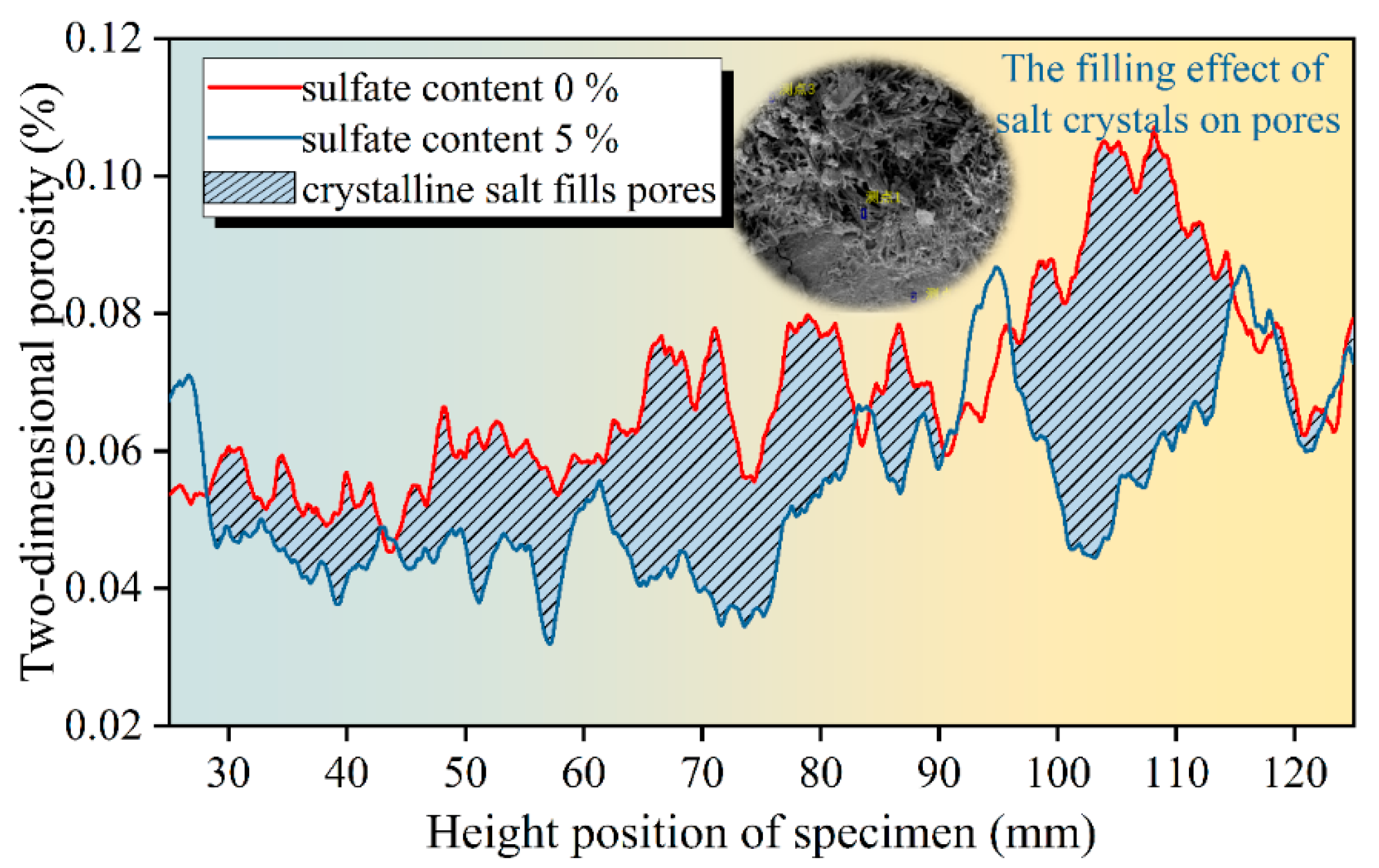 Figure 12. The solid line in the figure is the distribution curve of the layered porosity of different sulfate contents along the height of the specimen, and the shadowed part represents the filling effect on the pores caused by the crystals produced with 5% sulfate content. Based on the distribution of the layered porosity of the specimen along the height of the specimen, the upper porosity of the specimen is generally higher than the lower porosity of the specimen. This is because in the forming stage of the specimen and the early stage of cement hydration, the cement mortar in the specimen is wrapped by fine aggregates and deposited downward under the influence of gravity. This means that the proportion of fine aggregates in the lower part of the specimen is higher, the layered porosity is relatively low, and the porosity of the upper part of the specimen increases due to the loss of fine particles. By comparing the porosity of specimens with different sulfate contents, it can be seen that the layered porosity distribution curve of specimens with 0% sulfate content is basically higher than that of specimens with 5% sulfate content, which indicates that an increase in sulfate content will reduce the overall porosity of specimens and make the mixture denser. The layered porosity of the specimen with 5% sulfate content was taken as the baseline, and the layered porosity of the specimen with 0% sulfate content was integrated. The area of the shadowed part in the figure was calculated to be 1.50%, indicating that the expansive crystalline product produced with 5% sulfate erosion filled the 1.5% porosity of the specimen.