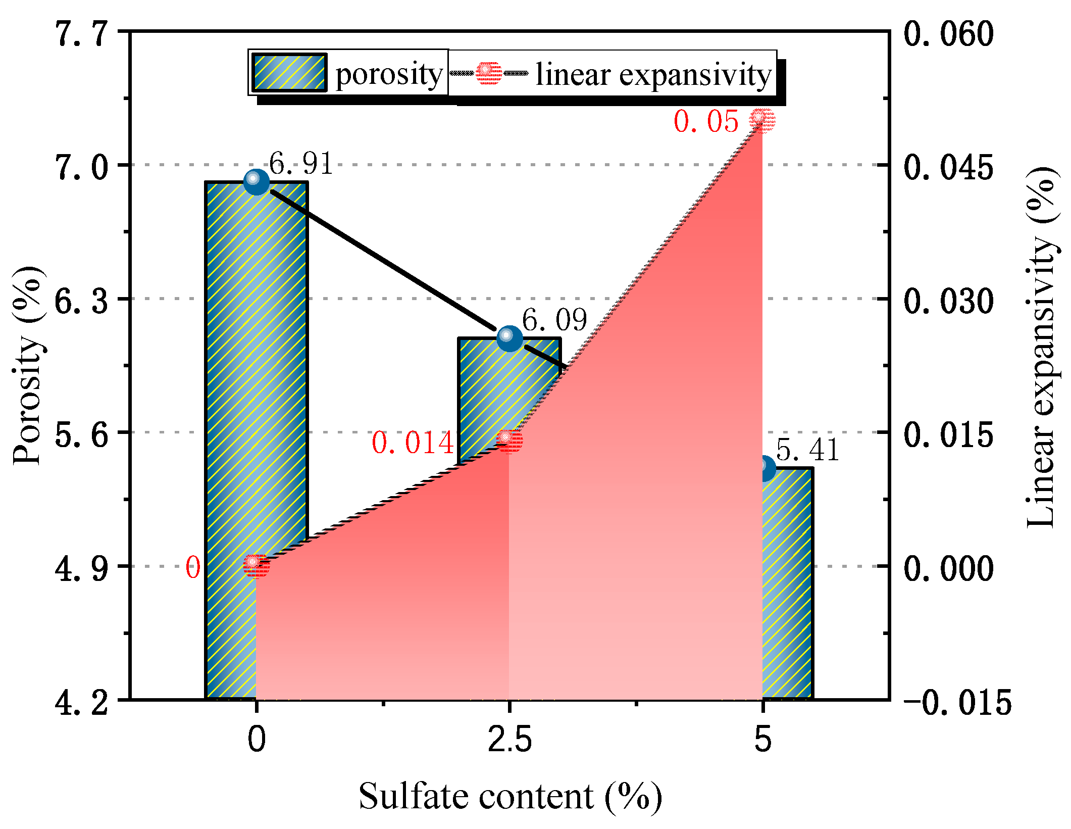 Figure 13 that with an increase in sulfate content in the specimen, the overall porosity of the specimen shows a decreasing trend. When the salt content increased from 0 to 2.5%, the volume porosity decreased by 0.82%. When the sulfate content continued to increase to 5%, the volume porosity decreased by 1.5%. This shows that with the increase in sulfate content, the yield of expansive crystalline phase in cement-stabilized macadam increases, and the continuous filling of the microscopic pores of the structure leads to a decrease in overall porosity. The measured linear expansion rate of the specimen also reflects this trend. When the specimen does not contain salt, it only shows dry shrinkage deformation, so the default linear expansion rate is 0. When the sulfate content is 2.5%, the linear expansion rate of the specimen increases to 0.016%. When the sulfate content is 5%, the volume porosity increases to 0.050%. The decrease in porosity and the increase in linear expansion rate under the action of sulfate erosion indicate that the filling of microscopic pores with the crystalline phase is the main cause of expansion deformation in the specimen at the macro scale.