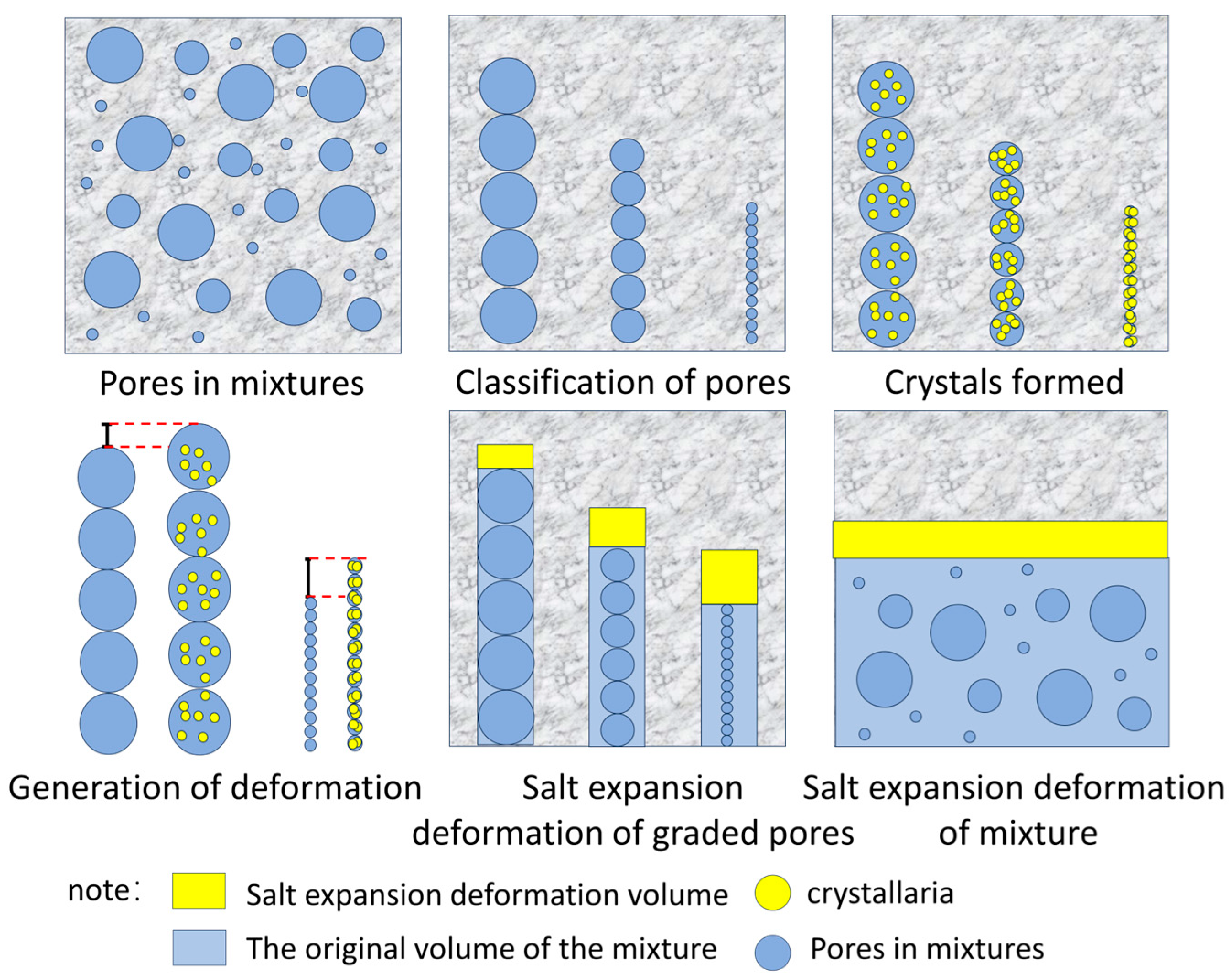 In summary, scholars have highlighted the important role of mesopores during sulfate attack in cement concrete. However, the impact of different pore sizes has rarely been considered in the literature, and methods to accurately predict salt expansion deformation are still lacking. Generally speaking, the pore structure of the specimen directly determines its ability to accommodate salt expansion, and the effects of different sizes of pores on deformation are expected to be different.
