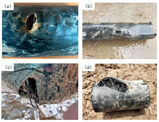 Case 1, in a gas well, the produced gas contained 4.6 g/m3 of hydrogen sulfide, with a daily water output of 280 m3. After gas–liquid separation, the gas field water was of the CaCl2 type, with a salinity of approximately 54,600 mg/L, a pH of 6.9, and a small amount of suspended solids. Steel-reinforced composite pipes were used to transport the water to an injection well. The pipe specification was DN100 (Diameter Nominal) × 11 (wall thickness) mm, with a design pressure of 6.3 MPa. The buried pipeline was 6.7 km in length; under normal operation, the inlet pressure was 2.9 MPa, the outlet pressure was 0.6 MPa, and the water temperature at the station outlet was 25–30 °C. Since commissioning in 2017, four instances of pipe body rupture and leakage have occurred, all located at the 6 o’clock position on the underside of the pipe in low-lying farmland sections. The failure mode in all cases was a circular bulging rupture, characteristic of local overpressure-induced burst failure, with exposed steel wires. The macroscopic failure morphologies are shown in Figure 1.
