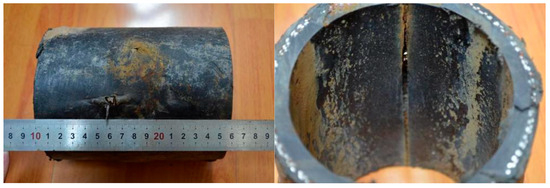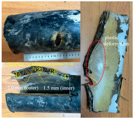 The first three failures exhibited similar morphologies. Taking the first case as an example for analysis, the rupture opening measured approximately 28 mm × 18 mm. Steel wires in the reinforcement layer were exposed in the failed area and showed clear signs of corrosion (Figure 2). At the fracture edges, both the outer and inner layers exhibited significant plastic deformation and wall-thickness reduction: the outer layer thickness decreased from 6.0 mm in the intact region to 2.0 mm in the failed region, while the inner layer thickness decreased from 7.0 mm to 1.5 mm, indicating that both layers ruptured due to overpressure. The intact regions of the pipe were relatively smooth and complete, while gray and brown loose deposits were observed inside the pipe.