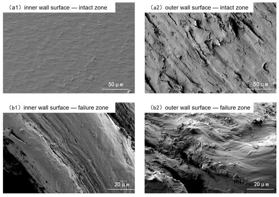Microscopic examinations were conducted on the inner and outer walls of both failed and non-failed regions using scanning electron microscopy (SEM), as shown in Figure 3. The inner wall of the non-failed region was smooth and flat, with no obvious pores or cracks. In contrast, the outer wall of the non-failed region was rough, with distinct textures, scratches, and small pores and depressions, indicating a trend of aging and degradation. In the failed region, both the inner and outer walls exhibited groove-like cracks and prominent stretched-deformation textures.