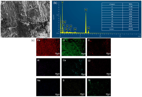 Corrosion morphology of steel wire corrosion products: (a) microscopic morphology, (b) elemental composition, (c) elemental distribution in the corrosion product layer.