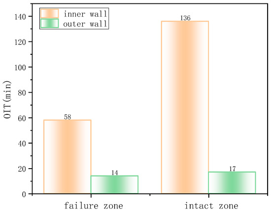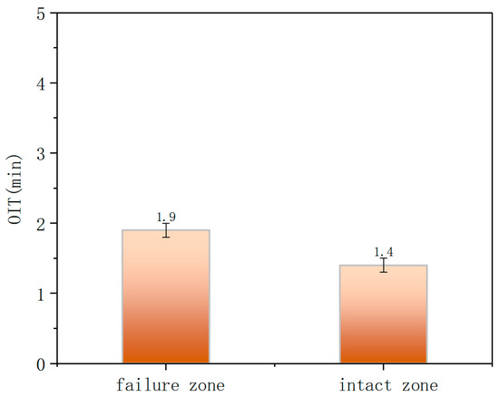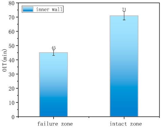DSC was used to measure the OIT of the polyethylene material in the inner and outer layers, reflecting the degree of antioxidant depletion and hence the material’s antioxidative performance (Figure 6). The OIT of the inner wall polyethylene in the non-failed region was 186 min, and in the failed region, it was 141.8 min. In contrast, the OIT of the outer wall polyethylene was only 14 min for both failed and non-failed regions, far below that of the inner wall and failing to meet the SY/T 6662.1-2022 standard requirement of not less than 20 min (at 210 °C). Normally, polyethylene exhibits a slow aging rate, with an ideal service life of ~30 years. However, in this case, severe aging occurred in the outer wall after only six years of operation, indicating low initial antioxidative performance and poor material quality.