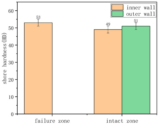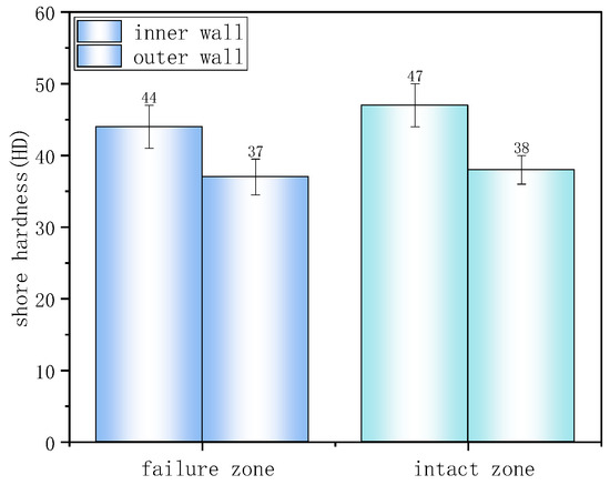 Shore hardness test results (Figure 7) showed that the hardness in both failed and non-failed regions of the inner wall was approximately 45 HD, higher than the outer wall’s 37 HD. Lower hardness reflects lower material crystallinity and weaker resistance to localized deformation damage such as indentation or scratching.