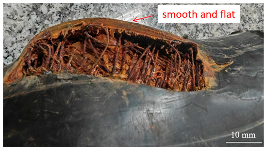 Figure 10 shows the macroscopic morphology after removal of the outer layer. In the central section of the longitudinal crack, the steel wire reinforcement layer was completely corroded, leaving only the bonding resin. Near the crack ends, steel wires were still visible, but all were completely fractured.