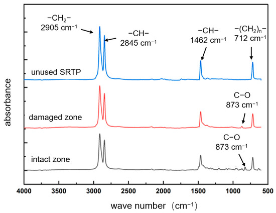 FTIR analysis results are shown in Figure 12. In the non-failed region, four characteristic absorption peaks were identified: at 2905 cm−1 (–CH2– saturated hydrocarbon stretching vibration), 2845 cm−1 and 1462 cm−1 (–CH– group vibrations), and 712 cm−1 (vibrations of –(CH2)ₙ– groups). In addition to these characteristic polyethylene peaks, the crack region also exhibited new peaks, such as a C–O stretching vibration near 873 cm−1. The presence of C–O bonds indicates oxidation of unsaturated double bonds in polyethylene, confirming that oxidative degradation occurred in the material near the cracking area.