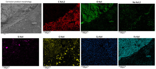 Corrosion morphology and elemental distribution of steel wire corrosion products.