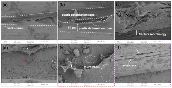 Micromorphology of the cracked inner wall region: (a) crack origin, (b) close-up of crack origin, (c) further magnified view showing micro-cracks, (d) crack branching, (e) magnified view of dense micro-cracks, (f) continuous axial micro-cracks.