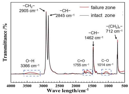 FTIR was employed to analyze functional groups in the inner-wall material of both failed and intact regions (Figure 19). The peaks at 2905 cm−1 and 2845 cm−1 correspond to the asymmetric and symmetric stretching vibrations of –CH2–, respectively; the peak at 1462 cm−1 corresponds to the bending vibration of –CH2–; and the peak at 712 cm−1 corresponds to the absorption band associated with multiple –CH2– linkages, representing the main chain of polyethylene molecules. In the failed region, stronger signals were detected for –OH (3366 cm−1) groups, as well as oxidation-related carbonyl C=O (1755 cm−1) and C–O (1041 cm−1) bonds, suggesting higher contents of these functional groups and indicating a more pronounced degree of aging.