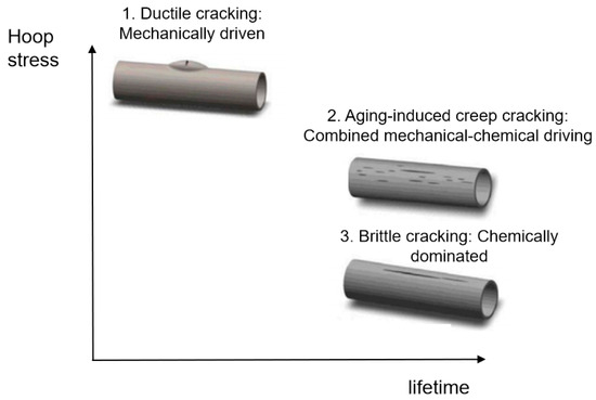 In summary, these results demonstrate that failure initiates with degradation or mechanical damage of the polyethylene layer, which provides pathways for corrosive media to attack the steel wires. This initial failure provides pathways for corrosive media, leading to corrosion of the steel wire skeleton. Although this failure mechanism is consistent, different service conditions and initial material states collectively determine the ultimate failure mode dominated by mechanical, chemical, or coupled mechanochemical factors: ductile cracking, aging-induced brittle cracking, and aging-induced creep cracking (Figure 22), with cracking primarily propagating in the axial direction.