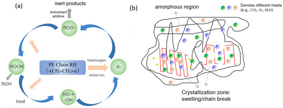 Figure 23. Schematic diagram of polyethylene aging mechanisms: (a) aging reaction; (b) medium penetration and swelling. - (3)