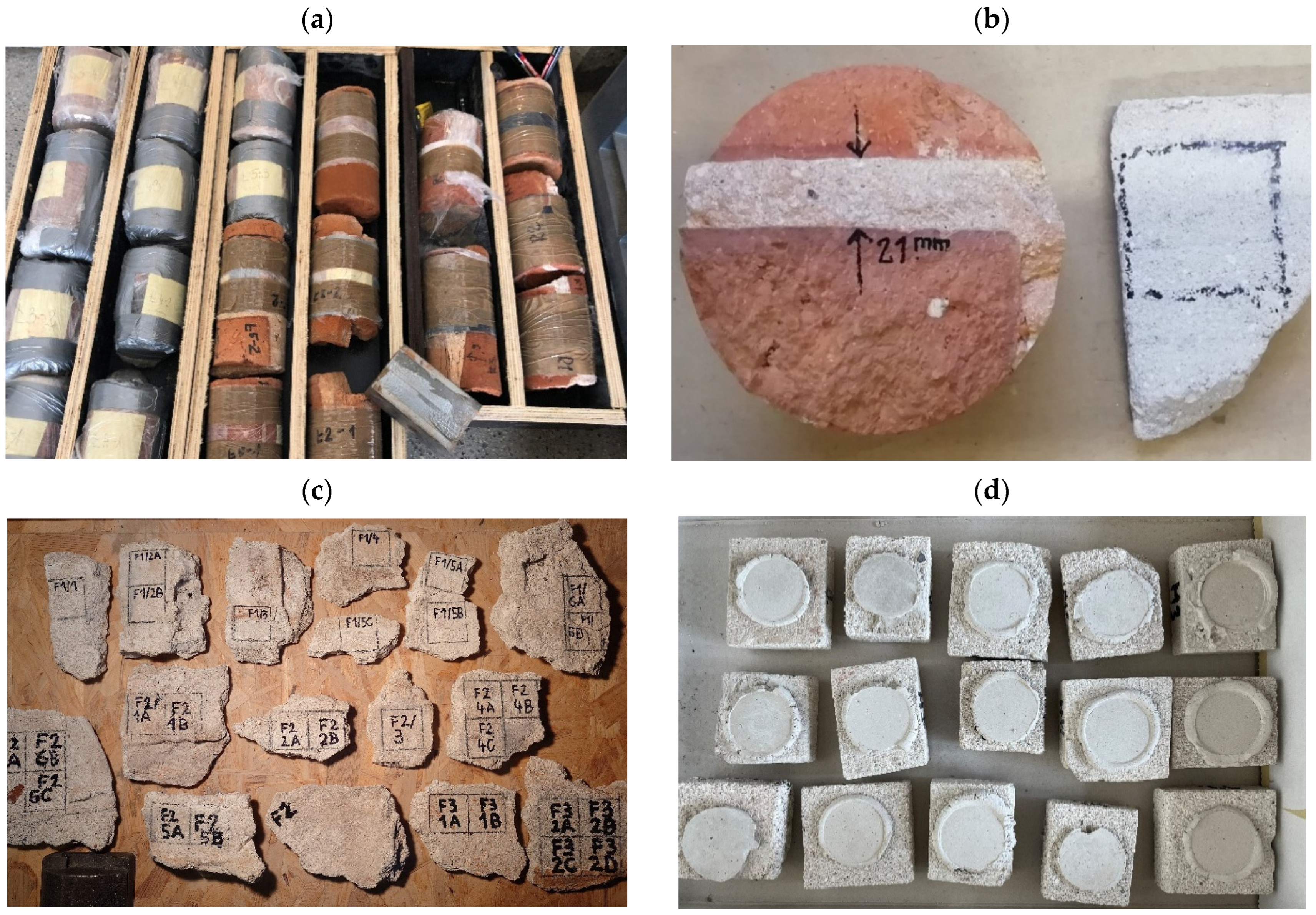 - Drdácký, M.F.; Makšìn, D.; Mekonone, M.D.; Slížková, Z. Compression tests on non-standard historic mortar specimens. In Proceedings of the HMC08—Historic Mortar Conference–Characterization, Diagnosis, Conservation, Repair and Compatibility, Lisbon, Portugal, 24–26 September 2008. [Google Scholar]