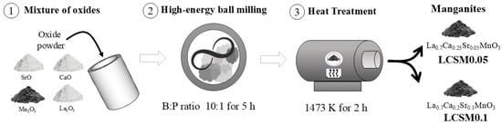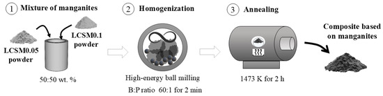 To prepare the composite, based on equal weights (50 wt. % each) of the manganites synthesized previously, LCSM0.05 and LCSM0.1, the mixture of manganites in proper proportions was attained, as shown in Figure 2. A total of 2 g of the mixture with 12 g of a hardened steel ball of 9.525 mm in diameter, using a ball-to-powder weight ratio of 60:1, was milled in the high-energy ball miller for 2 min in order to homogenize the mixture, using methanol as a process control agent, only during this step, to prevent agglomeration and ensure a uniform dispersion without modifying the stoichiometry of the pre-synthesized manganites [20]. The obtained powder was then annealed at 1473 K for 2 h as a strategy to promote particle bonding, as some studies have demonstrated the benefit of annealing in terms of the magnetocaloric properties of composites [21,22,23,24,25,26,27,32,33,34,35,36,37,38,39,40,41]. A flowchart of the experimental procedure is shown in Figure 2.