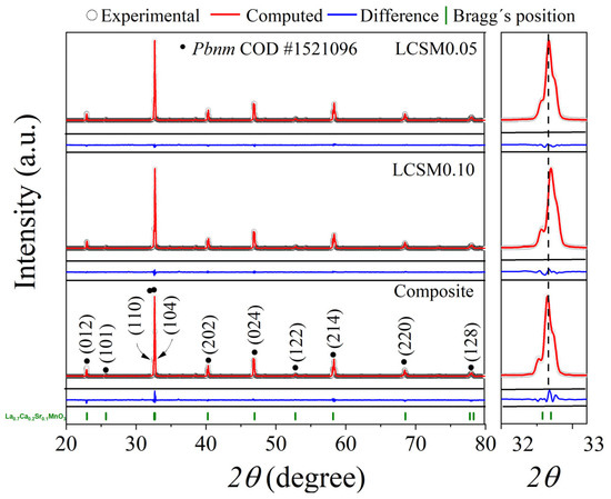 Figure 3 shows the X-ray diffraction (XRD) patterns of the individually synthesized manganites (LCSM0.05 and LCSM0.1) and the composite. The single-phase manganites show diffraction peaks corresponding to the orthorhombic perovskite structure of calcium-doped lanthanum manganite (La0.65Ca0.325MnO2.975, COD 1521096, Pbnm). Slight shifts in the 2θ positions of certain diffraction peaks, particularly those corresponding to the (110) and (104) planes (shown in detail on the right side of Figure 3), correspond to a change in interplanar distances, depending on strontium content, as larger strontium ions (ionic radius 1.26 Å) substitute smaller calcium ions (ionic radius 1.12 Å). The XRD pattern on the composite displays the same set of diffraction peaks, corresponding to a mixture of both the orthorhombic manganites.