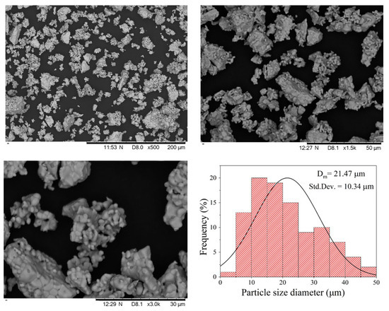 To analyze the microstructural characteristics of the composite powder, including particle morphology and size distribution, scanning electron microscopy (SEM) was employed. Representative micrographs at different magnifications are shown in Figure 4.