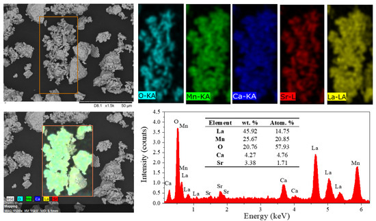 Energy-dispersive X-ray spectroscopy (EDS) was employed to qualitatively evaluate the chemical composition and elemental distribution across the composite powder, as shown in Figure 5. The corresponding spectra display only the expected peaks of the constituent elements, without detectable impurities, and the quantified values are consistent with the compositions of the manganites forming the composite. Additionally, elemental analysis is congruent with the presence of a mixture of both manganites. While the overall distribution of elements is homogeneous, variations in strontium content are observed in certain particles, confirming that individual particles have different compositions, consistent with the coexistence of manganites with distinct stoichiometries within the composite.