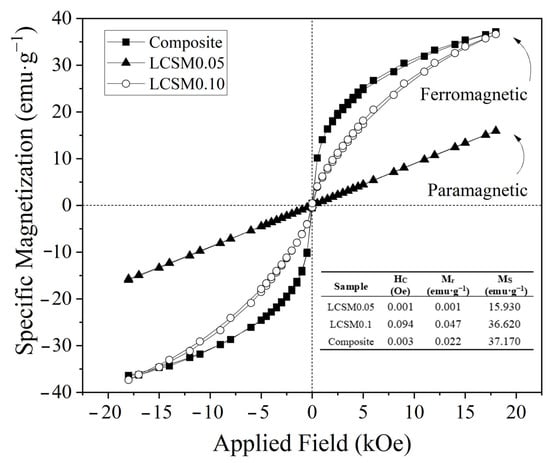 Magnetic hysteresis loops at room temperature (293 K) for LCSM0.05, LCSM0.1, and the composite. In the inset, the magnetic parameter, coercivity (Hc), remanent magnetization (Mr), and specific magnetization at 18 kOe (Ms) are presented.