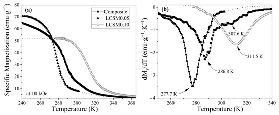 Moreover, the temperature dependence of the specific magnetization, shown in Figure 7, was used to determine the Curie temperature (TC) by analyzing the derivative of the magnetization curve. TC was identified at the maximum of the first derivative (dM/dT), which corresponds to the inflection point marking the transition from the ferromagnetic to the paramagnetic state. Measurements were carried out under a constant magnetic field of 10 kOe, and the obtained values were compared with those reported in the literature and presented in Table 3. As displayed in Figure 7a, the Curie temperature was determined as 277.7 K for LCSM0.05 and 311.5 K for LCSM0.1, with both values being in agreement with those previously reported for analogous manganite systems [30]. In contrast, the composite exhibits two distinct peaks at 286.8 K and 307.6 K, reflecting the coexistence and interaction of ferromagnetic and paramagnetic phases within the material. Additionally, the curve of the composite presents a very small deviation, indicating intermediate states that arise from the phase interaction. This behavior corroborates the presence of two predominant phases in the composite while simultaneously generating intermediate responses, thereby confirming the dual-phase nature of the system. Such coexistence is particularly advantageous for applications requiring tunable magnetic properties, such as magnetic refrigeration. Furthermore, the persistence of two main transitions together with the intermediate features after thermal treatment demonstrates that the designed composite preserves the targeted multiphase structure, enabling enhanced performance through the synergistic contribution of the different phases.