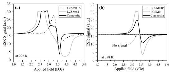 Electron spin resonance (ESR) spectra of LCSM0.05, LCSM0.1, and composite measured at (a) 293 K and (b) 378 K.