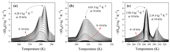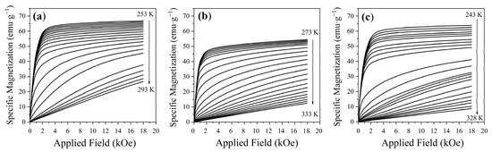 ΔSM, as a measurement of the magnetocaloric behavior of the materials, was calculated from the isothermal magnetization curves (Figure 9) using Maxwell’s relation [26]: