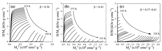 Arrott curves for (a) LCSM0.05, (b) LCSM0.1, and (c) composite.