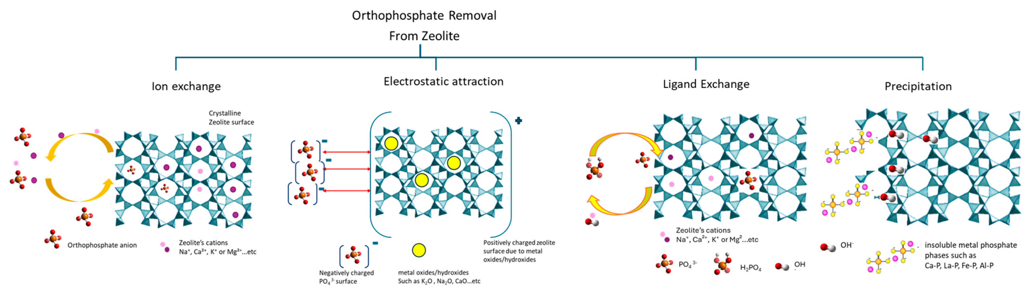 - Stocker, K.; Ellersdorfer, M. Phosphate Fixation and P Mineralogy on Natural and Ca-Modified Zeolites During Simultaneous Nutrient Removal. Water. Air. Soil Pollut. 2022, 233, 41. [Google Scholar] [CrossRef]