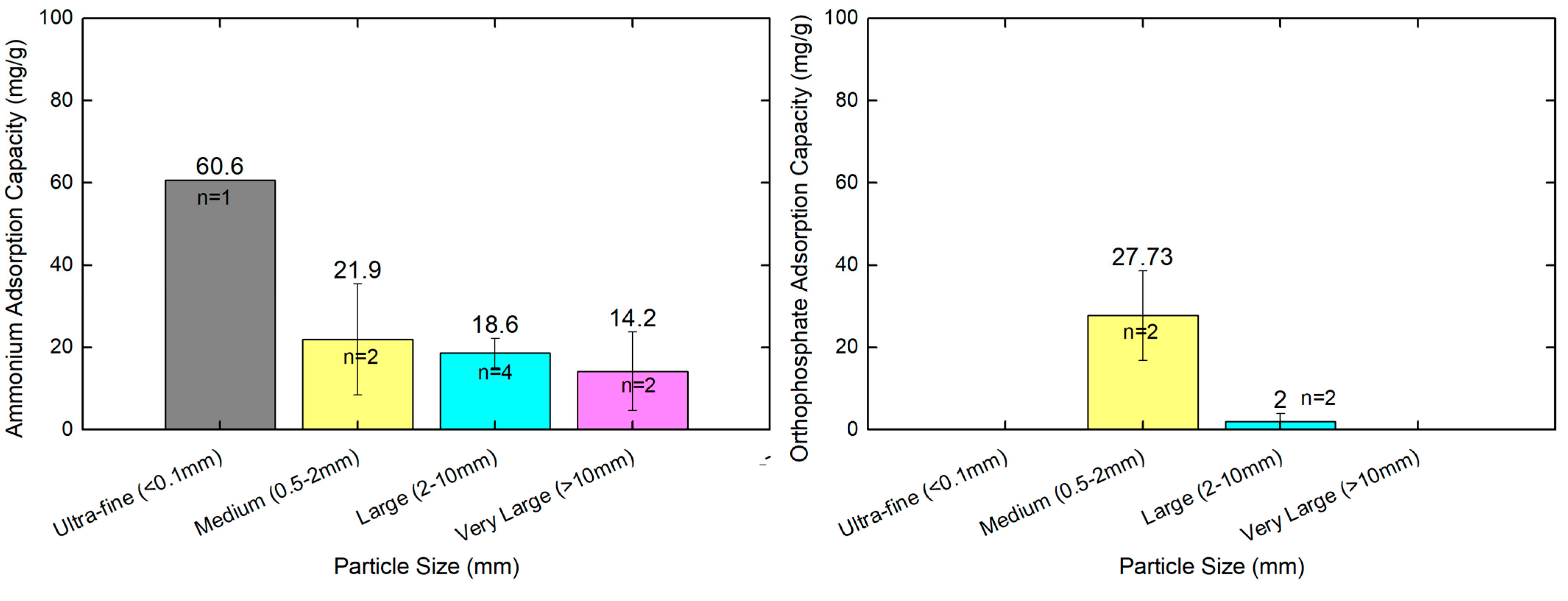 4.2. Comparison of Ammonium and Orthophosphate Performance per Particle Size
