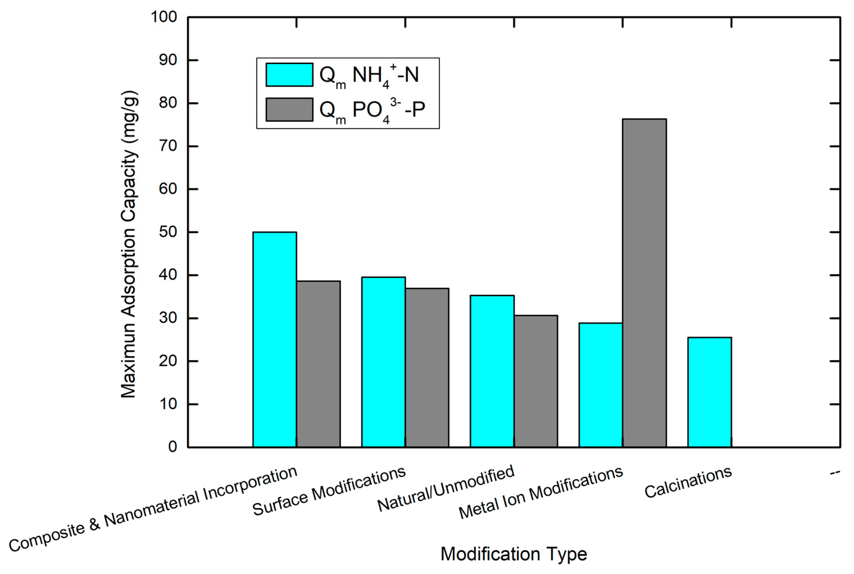 4.4. Comparison of Zeolites’ Ammonium and Orthophosphate Adsorption Capacity