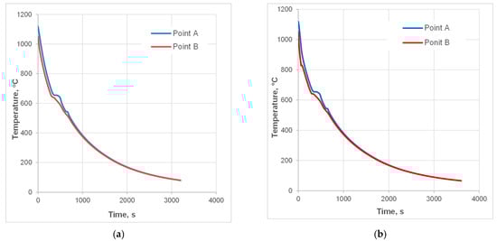 Another noteworthy piece of information derived from the simulation is that plots of temperature evolution during the entire forging cycle differ. In point A—in the interior of the bulky sample—it does not fall much below the start-forge point. For instance, at 1100 °C, the temperature is kept above 1090 °C. Contrary to the center, in the ribs (point B), the temperature is about 30 degrees lower due to the die chill, despite the rise caused by high-strain-rate deformation heat generation. In addition to geometry reasons, the fact that die-chill effect in the center of the part is more negligible is as a result of the heat flux towards the center from the flash, which is the hottest region in the volume of the sample part (point C in Figure 9b and Figure 10). Hence, the two selected locations, A and B, came up as two extreme points for observation: point A (interior) has the highest starting temperature with the lowest cooling rate and point B (the ribs) has the location of the lowest starting temperature with the predicted highest cooling rate.