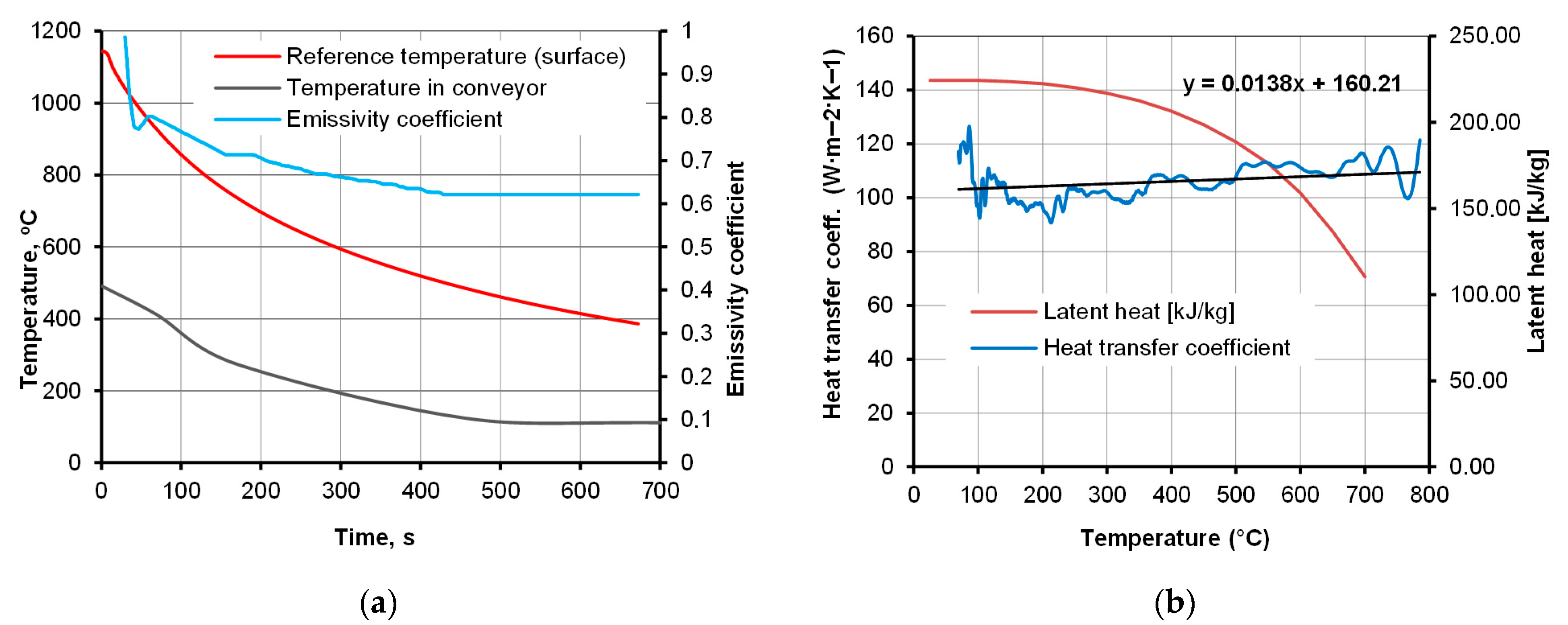 - Apostoł, M.; Skubisz, P.; Adrian, H. Determination of heat transfer coefficient for air-atomized water spray cooling and its application in modeling of thermomechanical controlled processing of die forgings. Materials 2022, 15, 2366. [Google Scholar] [CrossRef] [PubMed]