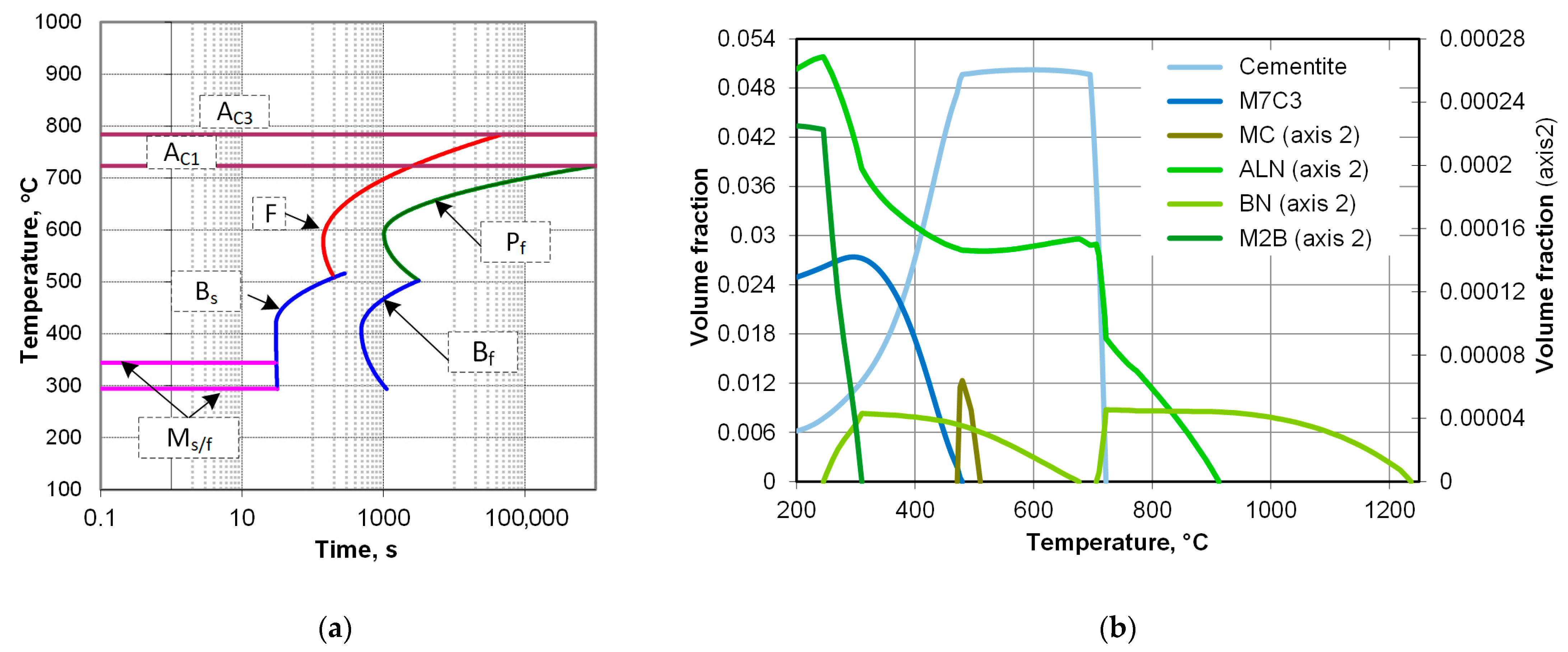 - Guo, L.; Roelofs, H.; Lembke, M.I.; Bhadeshia, H.K.D.H. Modelling of recalescence effect on austenite decomposition. Mater. Sci. Technol. 2017, 33, 1258–1267. [Google Scholar] [CrossRef]