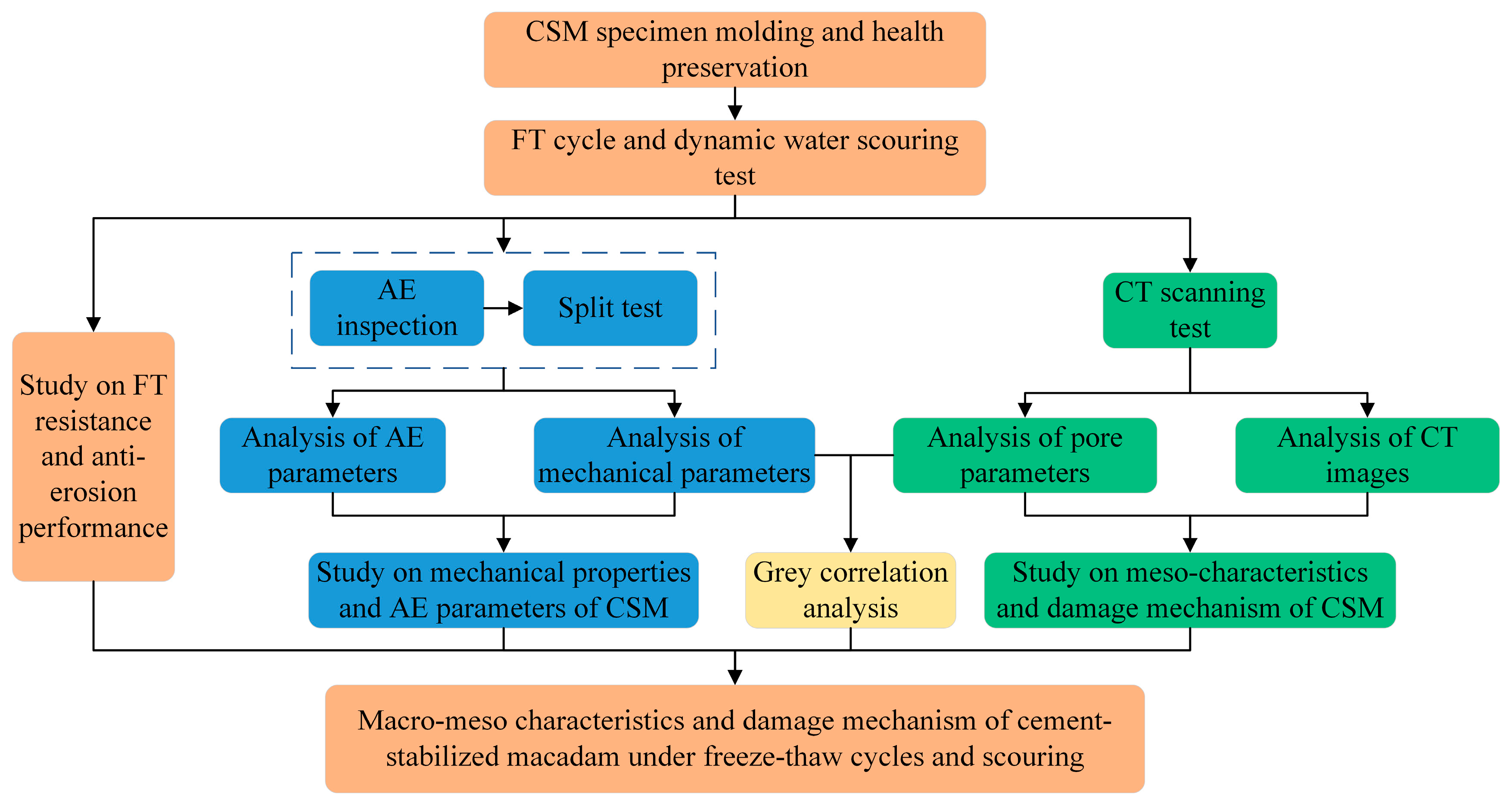 Although the existing studies have discussed the frost resistance and erosion resistance of CSM, most of them focus on performance changes under the action of a single factor, lack of systematic analysis of FT, and scouring coupling effect, and there is a certain degree of difference between the study of damage mechanism and the study of various properties. Therefore, for a long time, there has been a large deviation between the study of the damage state of pavement base materials and structures and the damage state under actual conditions. Researchers have failed to combine the actual environment of the base material and comprehensively consider the damage caused by various factors to the material. At the same time, the impact of various features is predominantly analyzed from a macro viewpoint, while research on the material’s damage mechanism from a mesoscopic perspective is comparatively limited. It is difficult to comprehensively analyze the failure mechanism of CSM semi-rigid base materials and propose reasonable disposal methods. Consequently, this study aims to systematically investigate the coupled effects of freeze–thaw cycles and dynamic water scouring on the mechanical degradation and mesoscopic damage evolution of cement-stabilized macadam (CSM). It is essential to conduct a focused study based on its material characteristics and actual service conditions, and it is practically significant to investigate the mechanical properties and damage mechanisms of CSM under FT and scouring conditions.