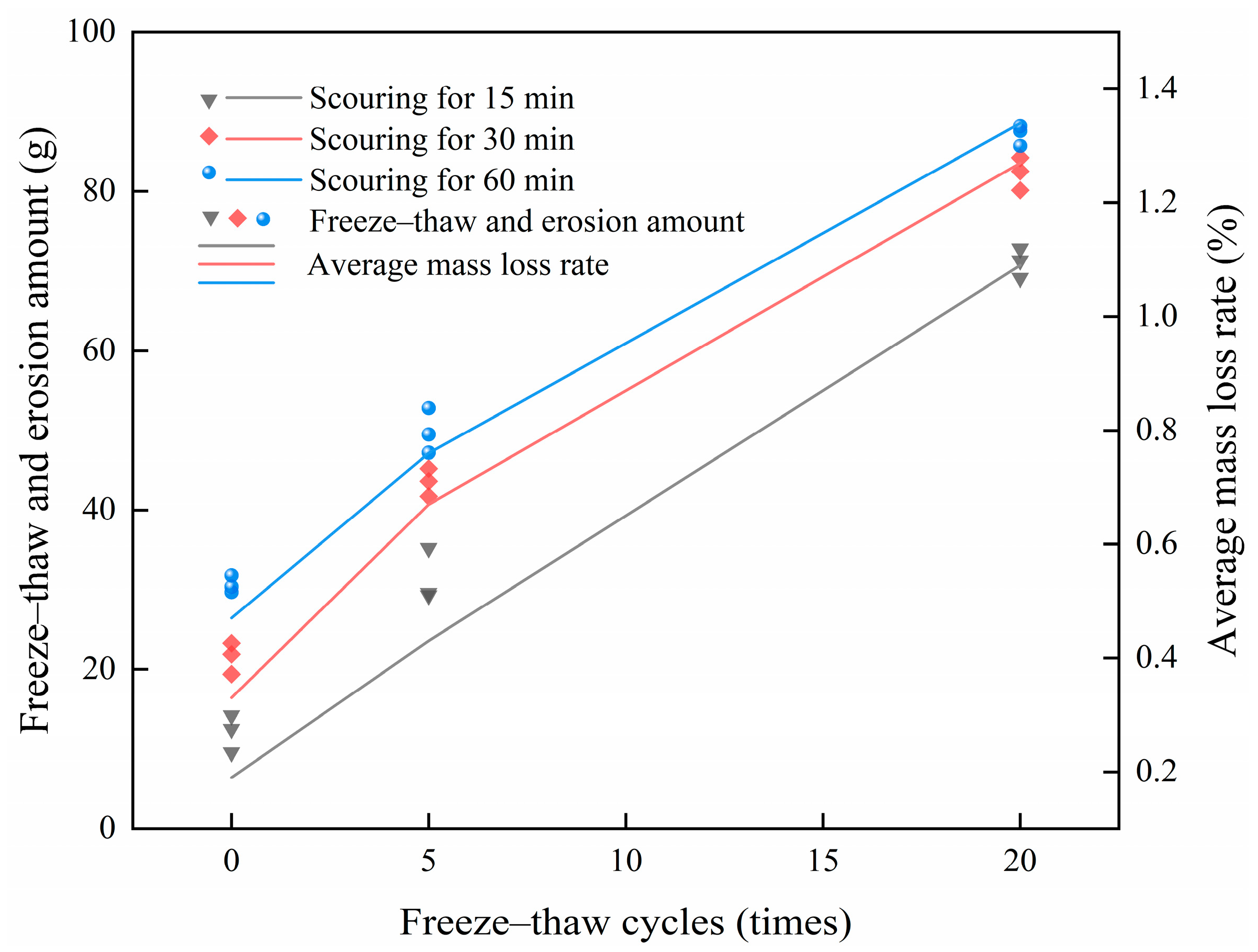 Laboratory simulations replicate the coupling of freeze–thaw cycles and dynamic water scouring, with systematic collection of mass loss, splitting strength, and full-process acoustic emission data.