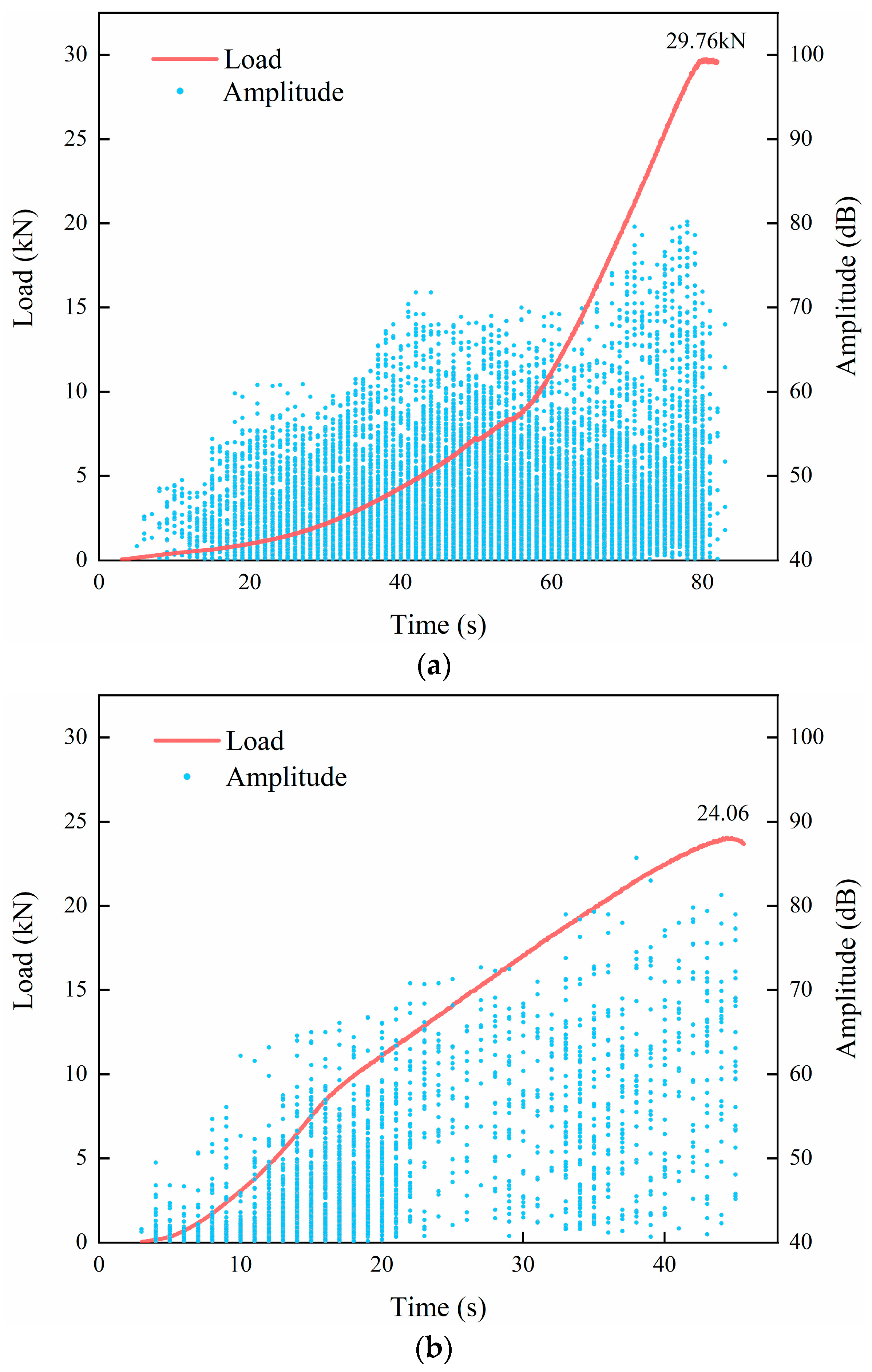 With the increase in FT cycles from 0 to 20, the cumulative ringing count of CSM specimens decreased from 185,697 times to 3943 times, the cumulative energy decreased from 8,627,507 eu to 138,620 eu, and the peak load decreased by 41.33%. The acoustic emission parameters diverged and decreased significantly with the increase in the number of FT cycles, indicating that the damage of the specimen was more serious.
