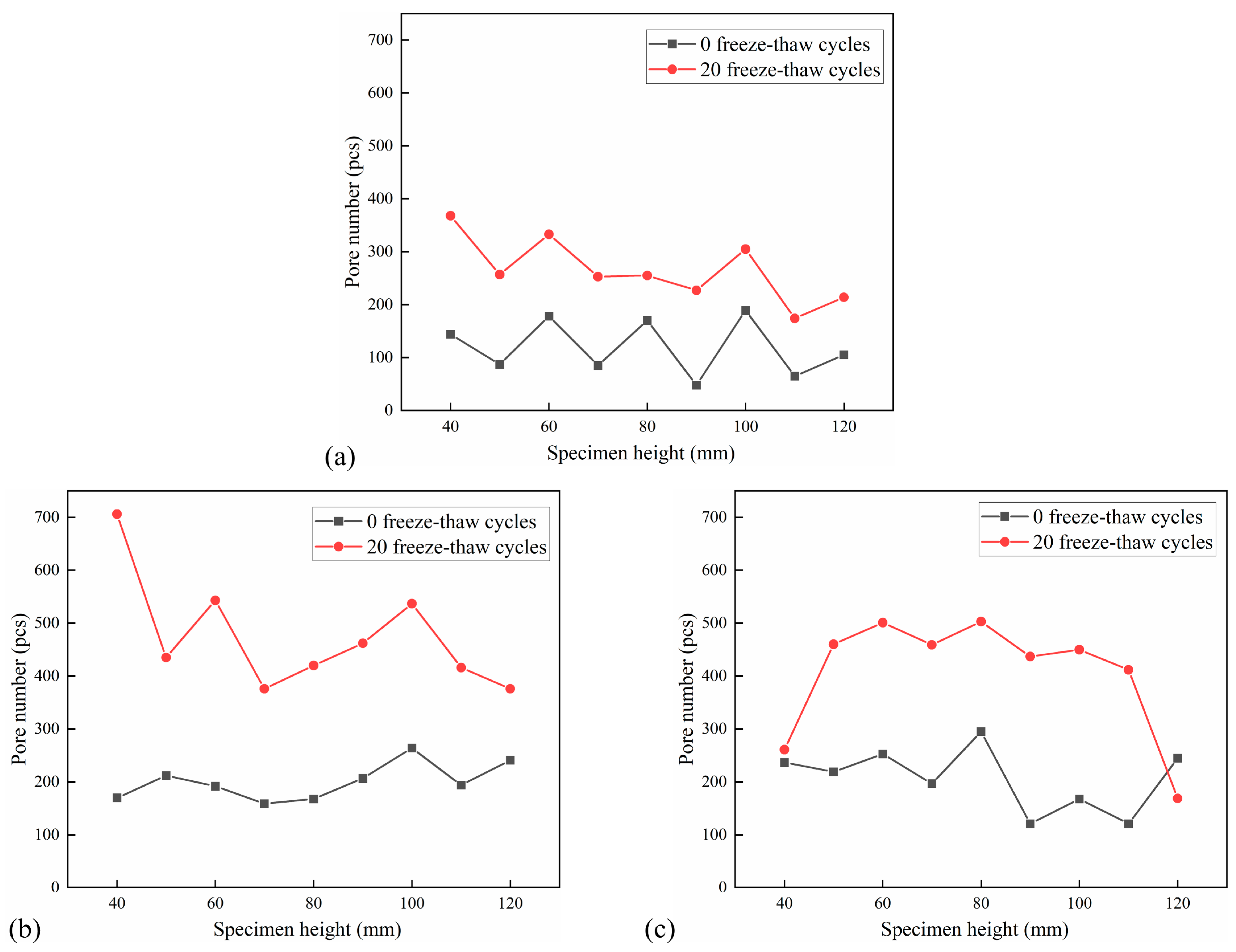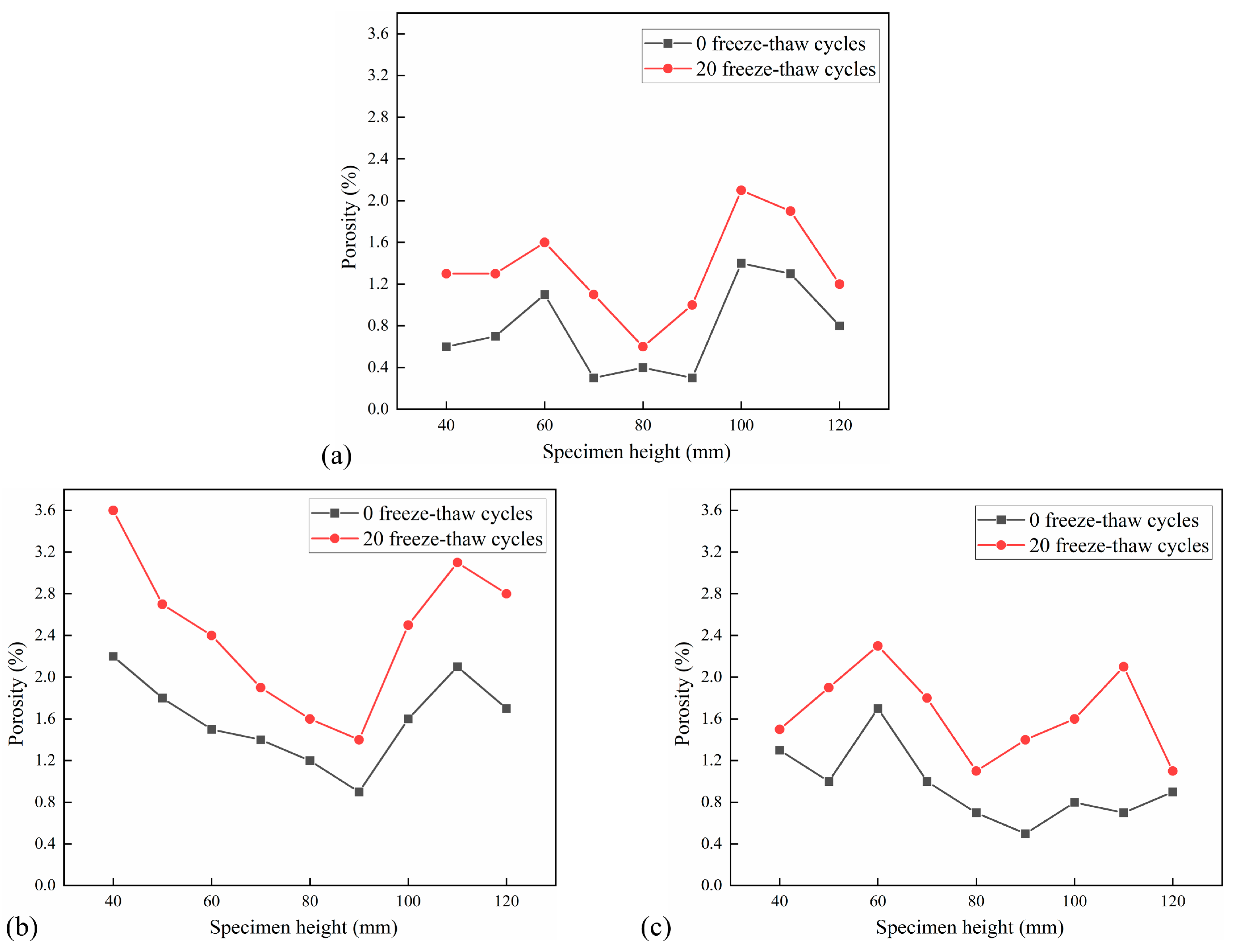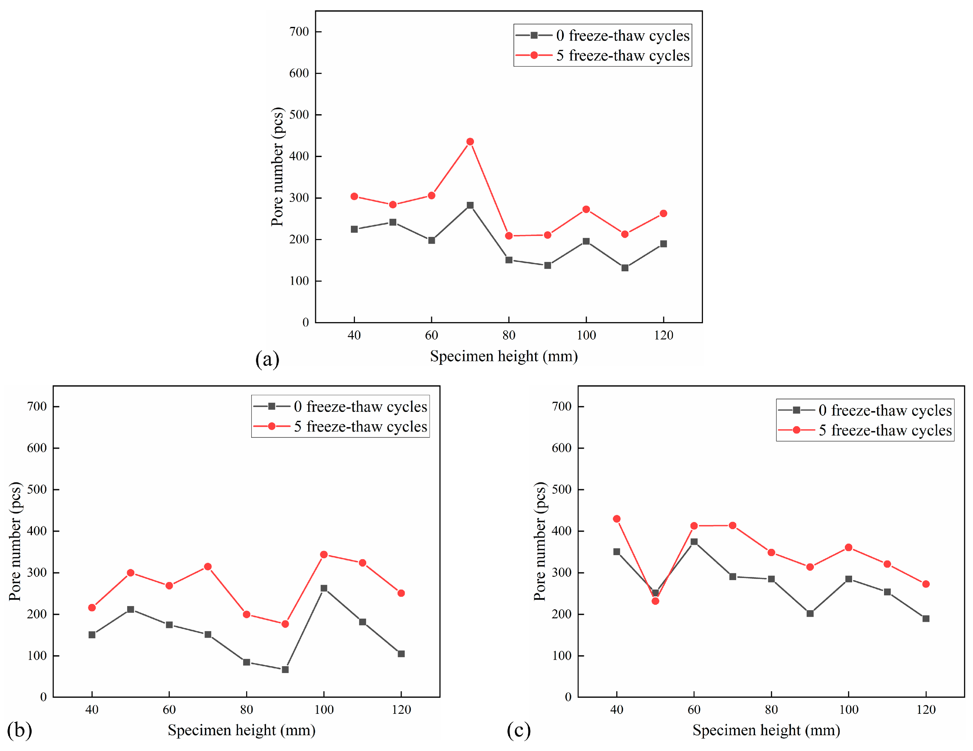 CT scans revealed monotonic increases in porosity and pore count with FT cycles, whereas average pore diameter decreased (indicating dominant microcracking). The volume of pores in the specimens was escalating, exacerbating the frost heaving force during the FT cycle and the erosive impact of running water in the scouring process. Frost-heave pressure, followed by suction during thawing/scouring cycles, progressively interconnected isolated pores, leading to macro-crack formation. Water infiltrated the fractures and generated a suction effect during the FT cycle, resulting in crack propagation and exacerbating the damage to the specimens.