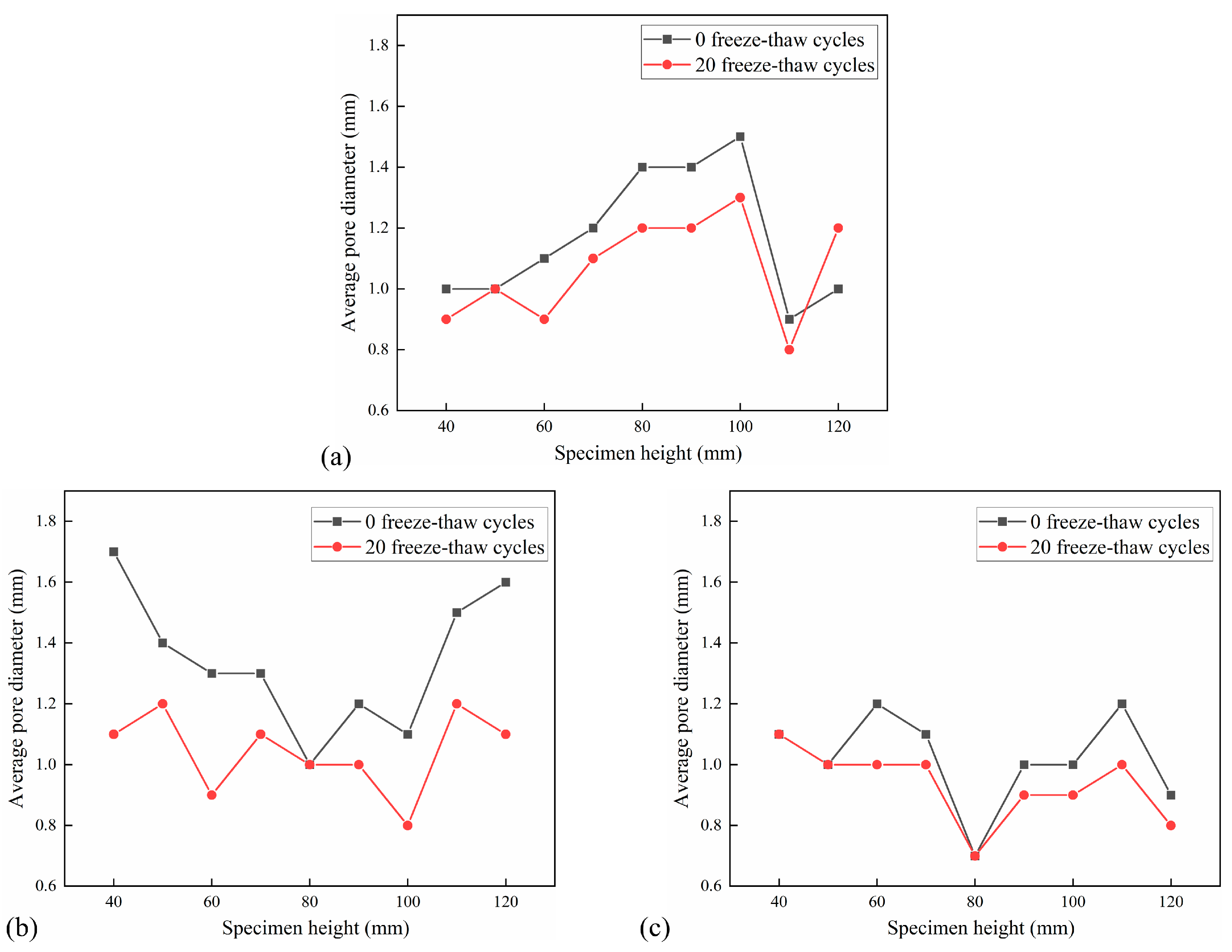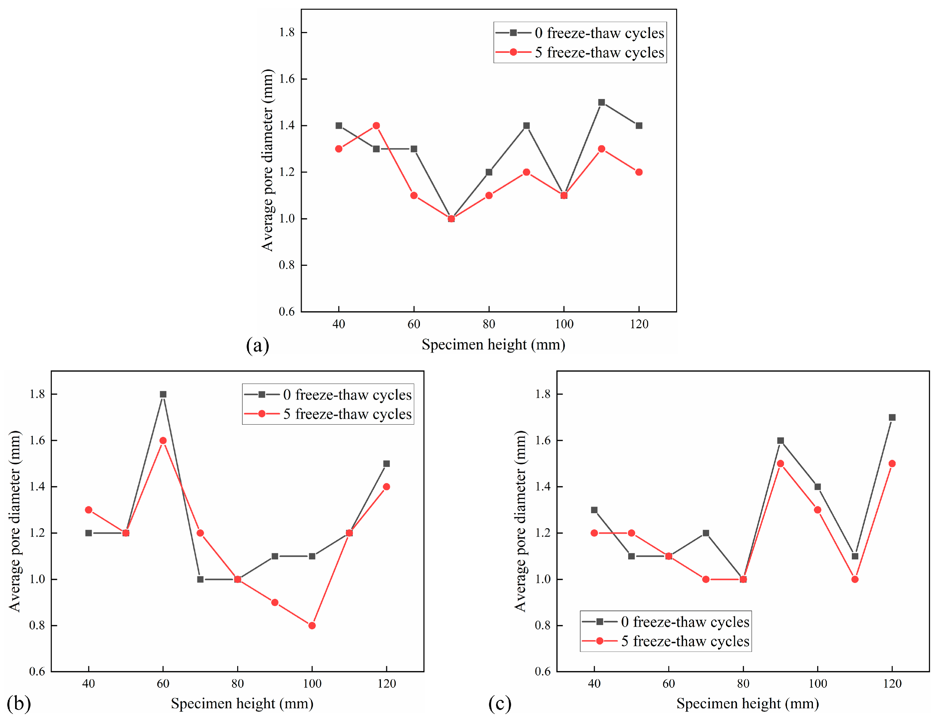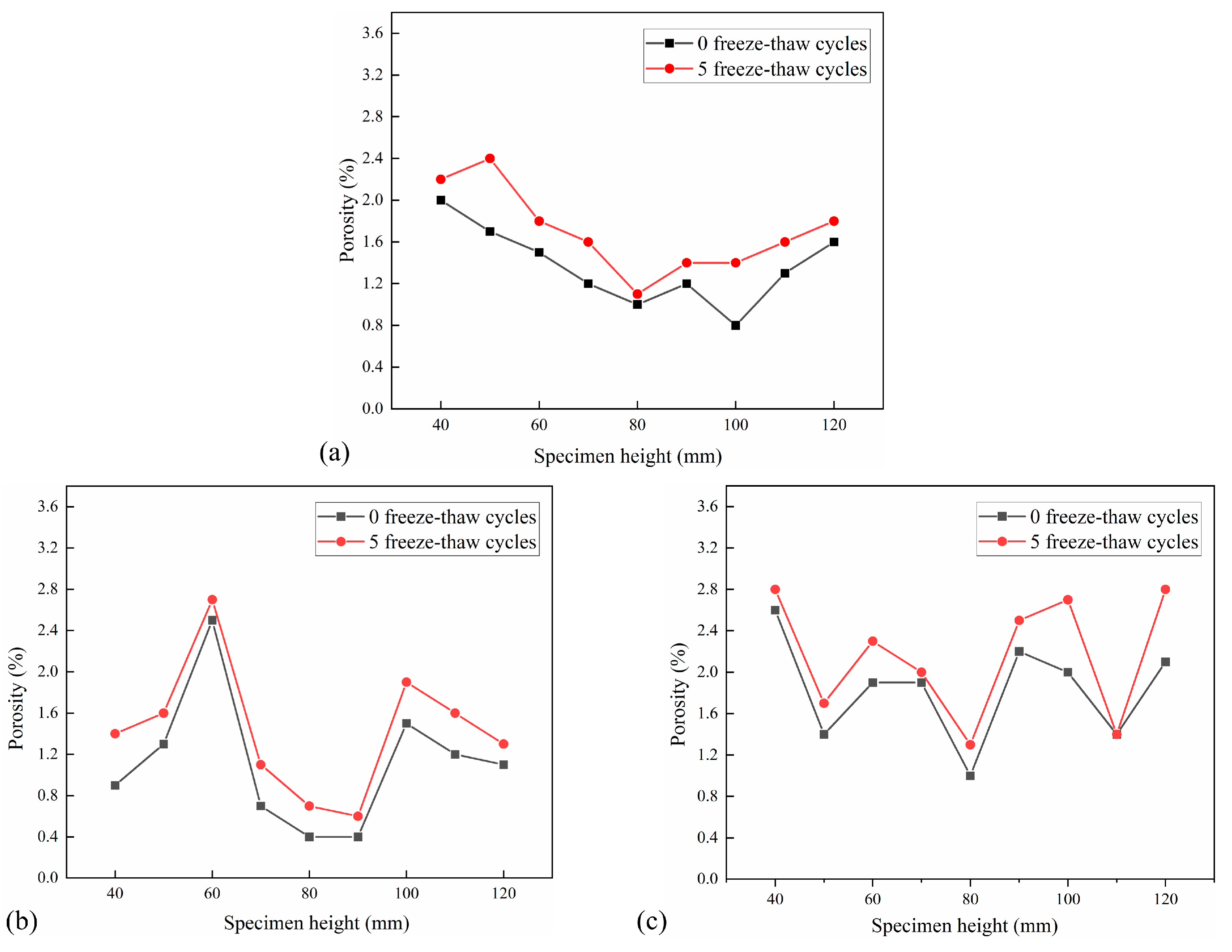CT scans revealed monotonic increases in porosity and pore count with FT cycles, whereas average pore diameter decreased (indicating dominant microcracking). The volume of pores in the specimens was escalating, exacerbating the frost heaving force during the FT cycle and the erosive impact of running water in the scouring process. Frost-heave pressure, followed by suction during thawing/scouring cycles, progressively interconnected isolated pores, leading to macro-crack formation. Water infiltrated the fractures and generated a suction effect during the FT cycle, resulting in crack propagation and exacerbating the damage to the specimens.