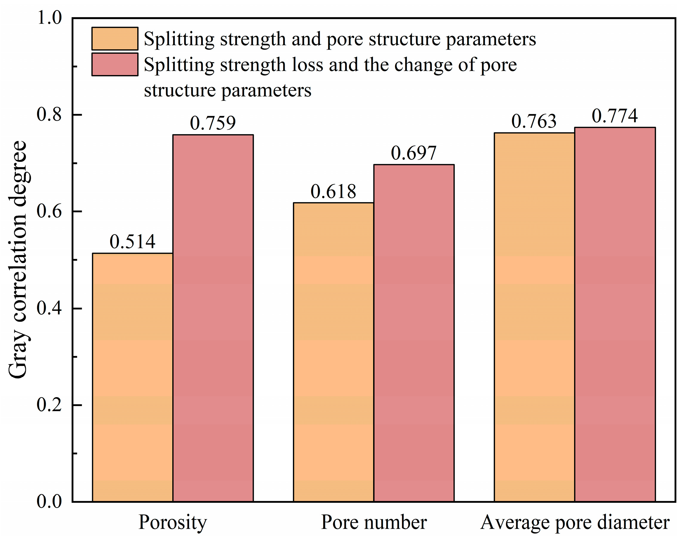 The gray correlation results show that the pore structure parameters of the specimens had a good correlation with their mechanical properties. The correlation degree between average pore diameter and splitting strength was the largest, and the correlation degree was r = 0.763. After the specimen was subjected to FT cycle and dynamic water scouring, the correlation between the change value of the average pore diameter and the loss value of the splitting strength was the largest, and the correlation degree was r = 0.774, indicating that the change was the dominant factor in the deterioration of mechanical properties. The correlation conclusion can provide quantitative indicators for non-destructive testing technology.