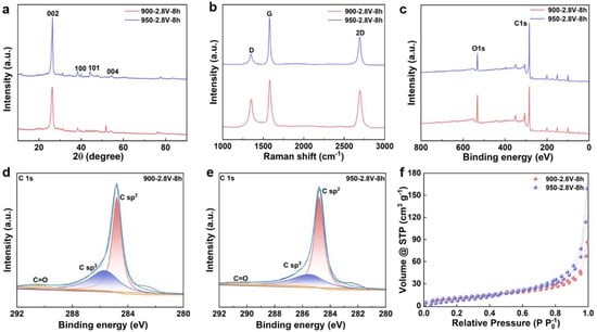 Characterization of Straw-Derived Biochar Following Graphitization. (a) XRD patterns; (b) Raman spectra; (c) full spectra of electrolysis products at 900 and 950 °C; (d) C 1s high-resolution XPS spectrum of electrolysis product at 900 °C; (e) C 1s high-resolution XPS spectrum of electrolysis product at 950 °C; (f) N2 adsorption–desorption isotherms of electrolysis products at 900 and 950 °C.