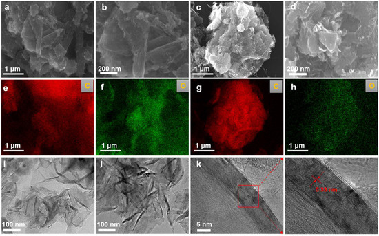 Microstructural evolution of electrolytically graphitized samples. (a,b) SEM micrographs depicting the morphological features of the sample synthesized at 900 °C and 2.8 V for 8 h; (c,d) corresponding SEM images of the product obtained under identical electrolysis conditions at an elevated temperature of 950 °C; (e,f) EDS elemental mappings of the sample electrolyzed at 900 °C; (g,h) EDS compositional profiles of the sample produced at 950 °C; (i) representative TEM micrograph of the sample prepared at 900 °C and 2.8 V for 8 h; (j) a TEM image illustrating the structural characteristics of the sample synthesized at 950 °C; (k) an HRTEM image revealing lattice fringes corresponding to graphitic ordering in the product formed at 950 °C and 2.8 V.