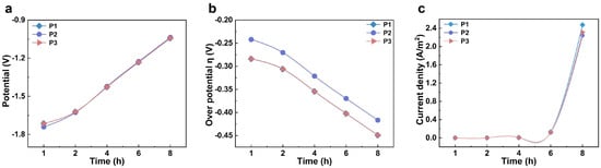 Using COMSOL finite element numerical simulation, this study investigated the influence of the relative positions of the anode and cathode on electrolyte potential distribution and electrochemical behavior. Based on the structural characteristics of carbonized products at different temperatures, a cathode surface model was constructed. Figure S5a,b present the simulation results of electrolyte potential on the cathode surface after applying a constant potential at 950 °C for 1 h and 8 h of electrolysis, respectively. The results show that, with increasing electrolysis time, the overall potential on the cathode surface shifts positively. During constant potential electrolysis, the voltage loss primarily compensates for cathodic polarization. Assuming stable system resistance, this results in a gradual positive shift in the cathode surface potential. To analyze the uniformity and evolution of the potential distribution, three characteristic points—P1, P2, and P3—were selected along the vertical axis of the cathode surface, corresponding to the top, middle, and bottom positions, respectively. As shown in Figure 3a, the electrolyte potential at each point increases with prolonged electrolysis time. Specifically, the potential at P1 changes from −1.714 V after 1 h to −1.043 V after 8 h; at P2 from −1.740 V to −1.037 V; and at P3 from −1.714 V to −1.042 V. These results indicate that the potential variation across different regions of the cathode surface remains relatively consistent throughout the electrolysis process, demonstrating good stability and uniformity in electrolyte potential distribution. The simulation outcomes align with experimental results, confirming that, under these temperature conditions, effective oxygen removal from carbonized straw is achievable, yielding a final product with uniform composition and a high degree of graphitization.