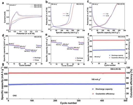 The energy storage performance was further assessed through galvanostatic charge–discharge (GCD) tests. At a current density of 100 mA·g−1, the first-cycle discharge specific capacities of the materials heat-treated at 900 and 950 °C were 211.4 and 233.2 mA·h·g−1, respectively (Figure 4b,c). The sample treated at 950 °C exhibited a higher reversible capacity compared to that treated at 900 °C, indicating that appropriately increasing the heat treatment temperature can enhance potassium storage performance. The rate capabilities of the two materials are presented in Figure 4d,e. At a current density of 50 mA·g−1, the sample treated at 950 °C delivered a discharge specific capacity of 234.9 mA·h·g−1. Even at a high current density of 1000 mA·g−1, it maintained a capacity of 174.5 mA·h·g−1, corresponding to a capacity retention of 74.29%. In contrast, the sample treated at 900 °C only delivered a discharge specific capacity of 209.1 mA·h·g−1 at 50 mA·g−1, suggesting a relatively limited potassium storage capability.