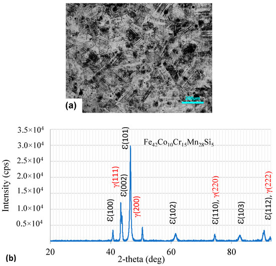 (a) Optical microstructure of Fe42Mn28Co10Cr15Si5 in as-received condition. The hcp-ε phase distribution in the fcc-γ matrix is revealed due to the hot-rolled condition. (b) XRD pattern of the Fe42Co10Cr15Mn28Si5 in the hot-rolled condition. Peaks corresponding to ε-martensite and austenite (γ) phases are observed.