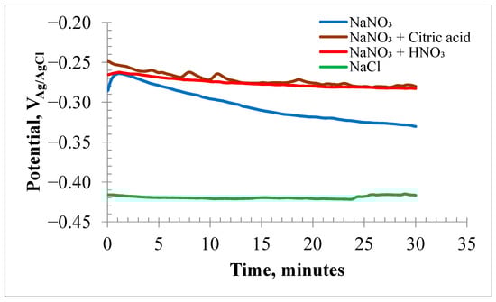 Figure 2 displays the OCP values of the HEA samples in various high-concentration electrolytes. The OCP in the neutral NaNO3 solution initially shifted to less negative values. After a few minutes, the potential shifted to more negative values, ranging from −262 mV to −330 mV. Conversely, the OCP values in the acidified nitrate solutions changed from −260 mV to −282 mV within 30 min. The 20% NaCl solution showed a more active corrosion potential of −420 mV.