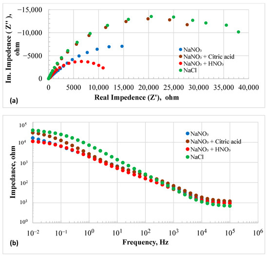 The EIS results of all the conditions were fitted with a three-time constant electrical equivalent circuit (EEC) as shown in Figure S1, and model parameters are listed in Table S2. In this EEC diagram, R0 represents electrolyte resistance, which was the highest in the 20% NaNO3 + 0.01M citric acid solution and the lowest in the 20% NaCl solution. The EEC consists of three capacitive loops and one inductive loop. The inductive loop represents the adsorption of the anions on the surface of the electrode [37]. The impedance of an inductor is given as Z = j2πfL, while the impedance of a capacitor is 1/(j2πfC). Therefore, as the frequency approaches zero, the impedance of the inductor is negligible, and the impedance of the capacitor reaches infinity. At low frequencies (reaching the DC condition), the resistance can be simplified as [37]: