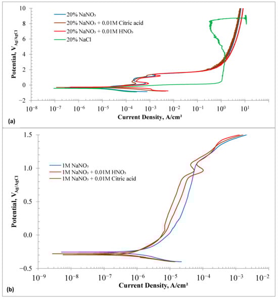 (a) Potentiodynamic Polarization plots of HEA samples in electrolytes of 20% NaNO3, 20% NaNO3 + 10 mM Citric acid, 20% NaNO3 + 10 mM HNO3 and 20% NaCl solutions at room temperature. (b) Potentiodynamic Polarization plots of HEA samples in electrolytes of 1 M NaNO3, 1 M NaNO3 + 10 mM Citric acid, and 1 M NaNO3 + 10 mM HNO3 solutions at room temperature.