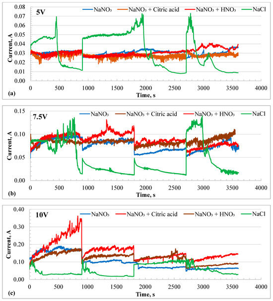 Current–time (I-t) profiles of HEA during potentiostatic electrochemical machining in different electrolytes at different potentials. (a) at 5 V, (b) 7.5 V, and (c) 10 V. The experiments were interrupted every 15 min to measure the depth of material machined. The current spikes are due to the interruptions.