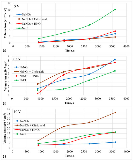 The sample rested flat at the bottom of the beaker, with the insulated Pt wire counter electrode positioned just above it. The dissolved species were transported by natural convection caused by the electric field and heat generated through Joule heating. As a result, the supersaturated solution near the sample surface led to a decrease in current. The current spikes were less at 10 V in the chloride solution but were more prominent in the nitrate + citric acid solution. However, the current increased instead of decaying in the nitrate solutions. The current increased with the applied potential for all electrolytes, except in the chloride solution at 10 V. Here, only current, not current density, was reported because the affected area varied depending on the electric field distribution. The lower current in the chloride solution at 10 V could be attributed to a more focused electric field. To better understand the I-t profiles, the resulting volume loss due to charge accumulation was plotted over time and presented in Figure 6a–c. The highest volume loss during ECM at 5 V was recorded in the chloride solution. All nitrate solutions showed similar volume losses at 5 V. However, ECM at 7.5 V showed a reverse trend compared to that observed at 5 V. The chloride solution resulted in the lowest volume loss, while the neutral nitrate solution exhibited the highest volume loss after 1 h, with volume loss increasing linearly over time. At 10 V, the ECM in the nitrate + citric acid solution had the highest removal rate of material, followed by the chloride solution.